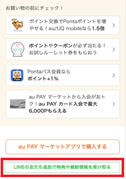 商品ページ内の「LINEの友だち追加で~」と記載されているボタンをタップします。